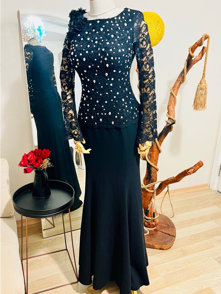 Uzun kollu, yüksek yakalı siyah abiye elbise, payetli desenli üst kısmıyla klasik ve zarif bir görünüm sunar. ✨