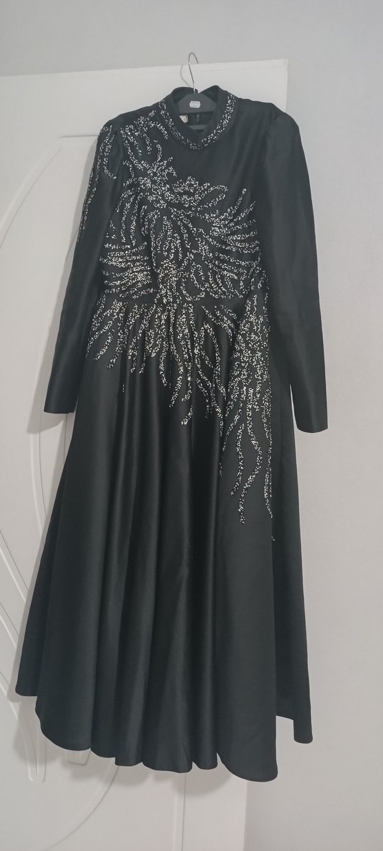 Uzun kollu, tekne yaka ve payet işlemeli siyah gece elbisesi, düzenli kesimle dikkat çekiyor. ✨