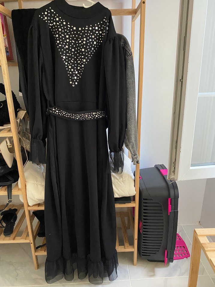 Siyah uzun elbise, bol kesim, yüksek yaka ve uzun kollu. Nakışlı desenler ve payet detaylarıyla gotik tarzda, günlük kullanıma uygun. düğün için giyildi ihtiyaç olmadığı için satıyorum kumaşı gayet güzel şık bir elbise iç belli etme sorunu yok.
