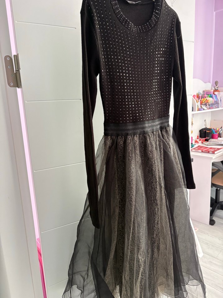 Siyah, uzun kollu, vücuda oturan bu elbise, payet detaylı üst kısmı ve desenli, tül katmanlı uzun etek kısmıyla parti için uygundur. 9 10 11 yaslara uygundur