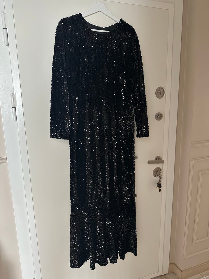Uzun kollu, yuvarlak yakalı siyah abiye elbise, tamamı payetlerle kaplı şık ve desenli görünüme sahip. Parti için ideal.