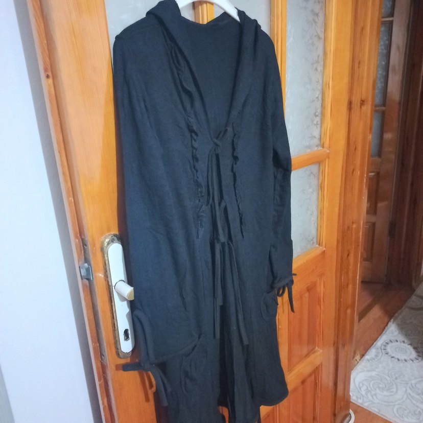 Uzun kollu, bol kesim siyah stile sahip. Bel ve kollarda ayarlanabilir bağcıkları bulunur.