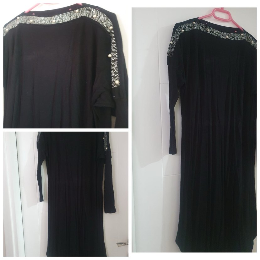 Siyah uzun kollu, yuvarlak yakalı, bol kesim elbise. Pile detaylı ve omuzlarda süslemeleri bulunan, yumuşak sentetik kumaştan yapılmıştır. Minimalist goth tarzına uygun.
