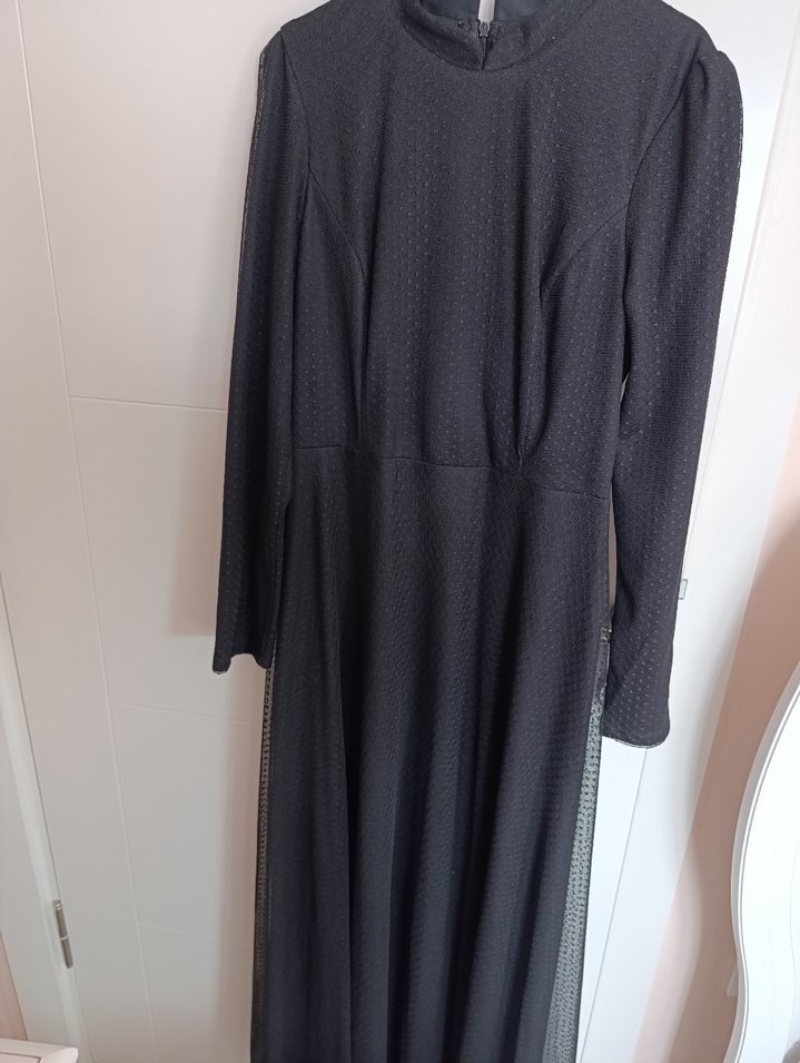 Yumuşak sentetik kumaştan, uzun kollu, yüksek yakalı ve pilili tasarıma sahip siyah uzun elbise. Gotik stilde, rahat kesimlidir.