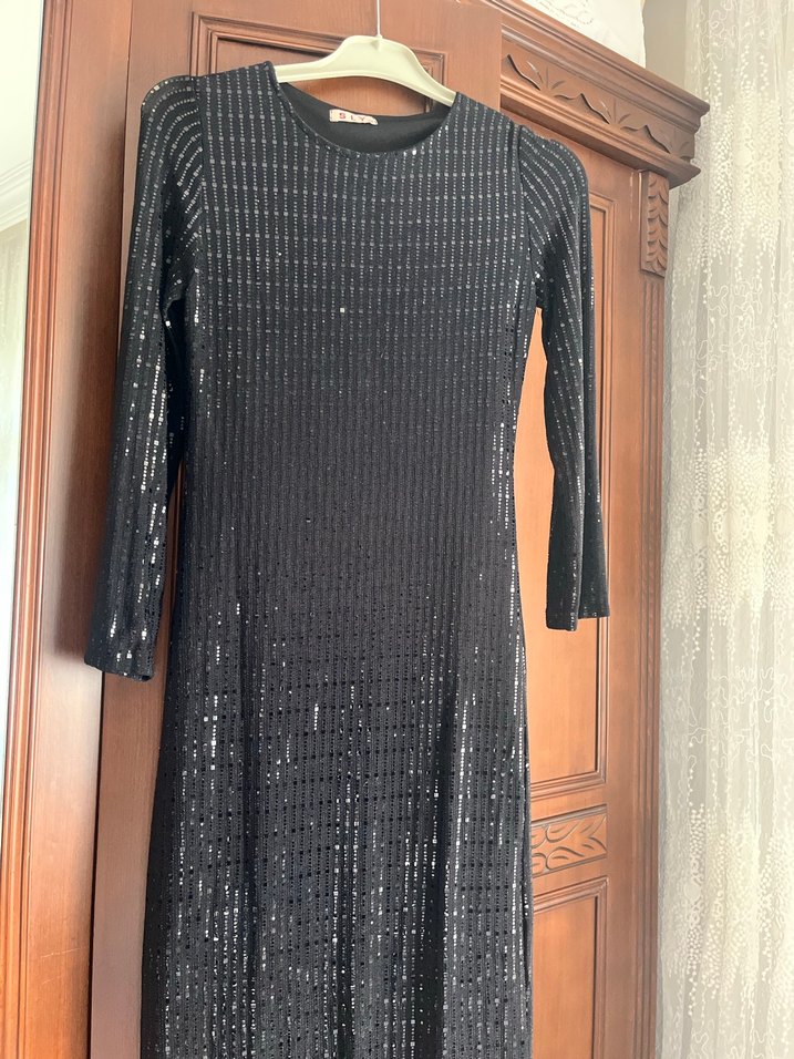 Bu uzun siyah abiye elbise, pilili detaylar ve uzun kollu tasarımıyla fitted kesime sahiptir. Yuvarlak yaka ve hafif parlak dokusuyla dikkat çeker.