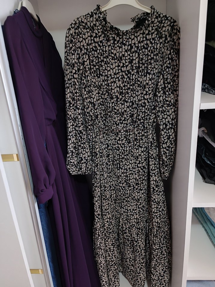 Uzun kollu, yüksek yakalı ve bol kesimli siyah pilili elbise. Bağlama deseniyle günlük kullanıma uygun trend sokak stili.