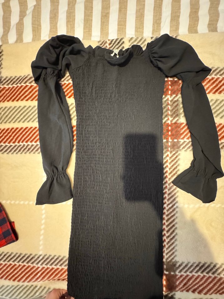 Siyah renkli, uzun kollu ve pilili detaylara sahip bu dar kesim elbise, tekne yaka ve günlük kullanım için uygun şık bir tasarımdır.