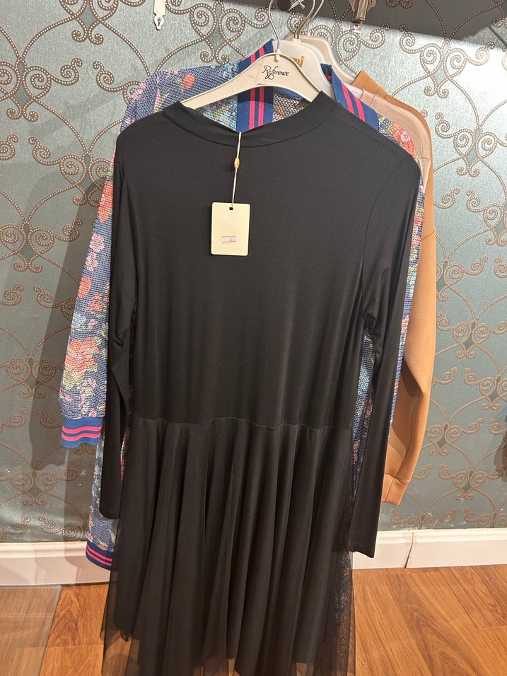 Siyah uzun elbise, yüksek yakalı ve uzun kollu, bol kesim ve pilili etek kısmı sentetik kumaştan. Bohem ve retro tarzlara uygun, günlük kullanıma uygun.