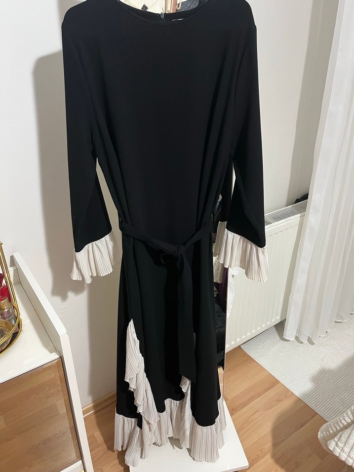 Sentetik kumaştan, pilili manşet ve etek ucu detaylı, bol kesim siyah uzun elbise. Uzun kollu, yuvarlak yakalı, ofis için uygun goth Paris tarzı.