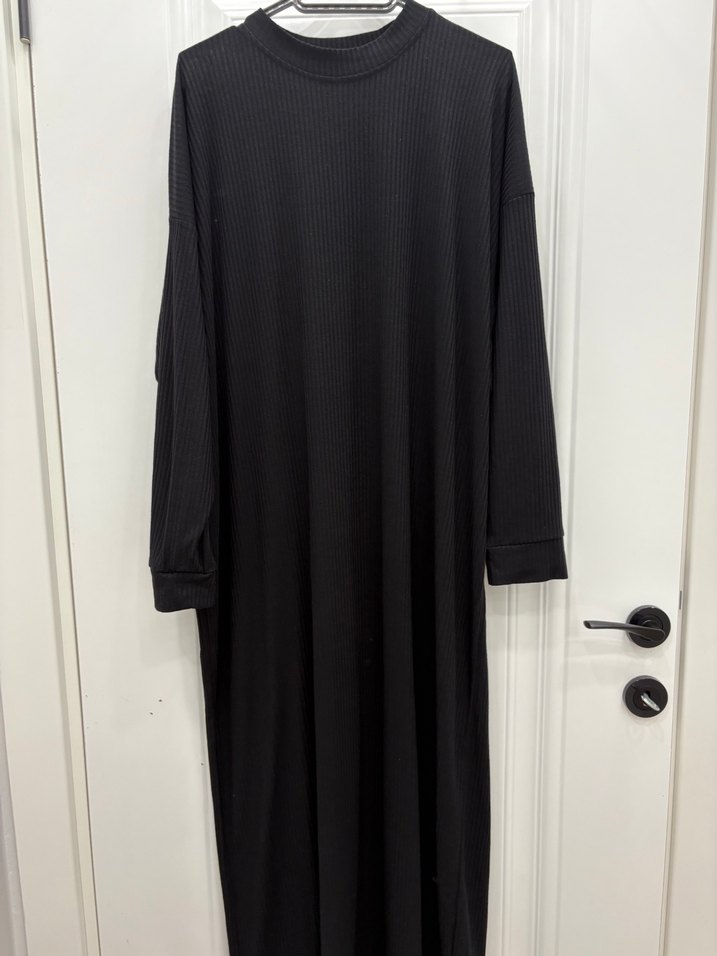 Siyah uzun elbise, uzun kollu ve yüksek yakalıdır. Yumuşak sentetik kumaştan, piliseli ve bol kesimdir. Günlük sade şıklık için uygundur.