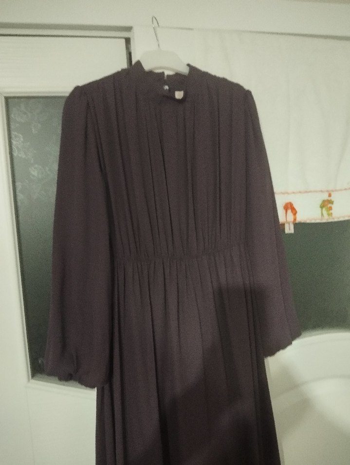 Siyah renkte, yüksek yakalı ve uzun kollu, bol kesimli bu elbise yumuşak ve parlak kumaştan üretilmiştir. Piliseli detaylar ve minimalist gotik tarzıyla ofis için uygundur.