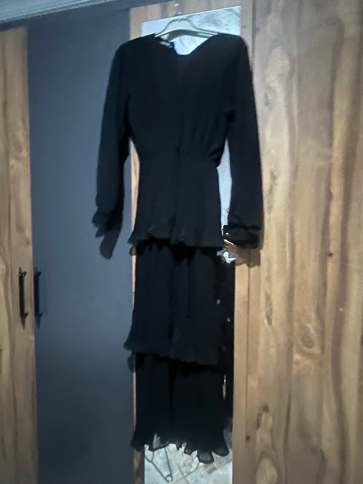 Siyah uzun elbise, uzun kollu ve kesik yaka detayına sahiptir. Piliseli, regular fit ve sentetik kumaştan üretilmiştir, ofis için uygundur.