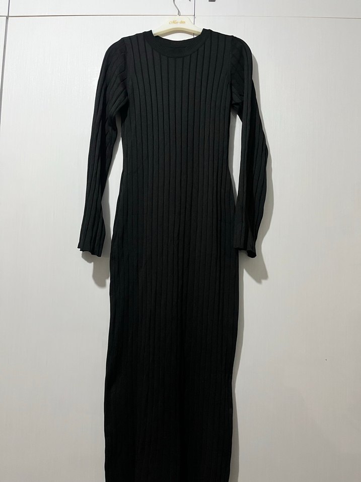 Siyah uzun elbise, piliseli ve vücuda oturan kesimi ile yüksek yakalıdır. Uzun kollu, minimalist tarzda, günlük kullanıma uygundur. ✨