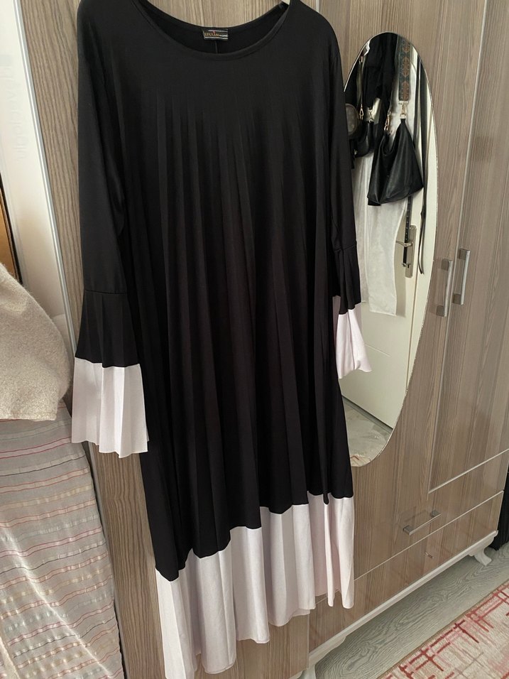 Siyah uzun elbise, bol kesim ve beyaz piliseli manşet ile uç detaylarına sahiptir. Kayık yaka ve uzun kolludur, yumuşak sentetik kumaştan yapılmıştır.