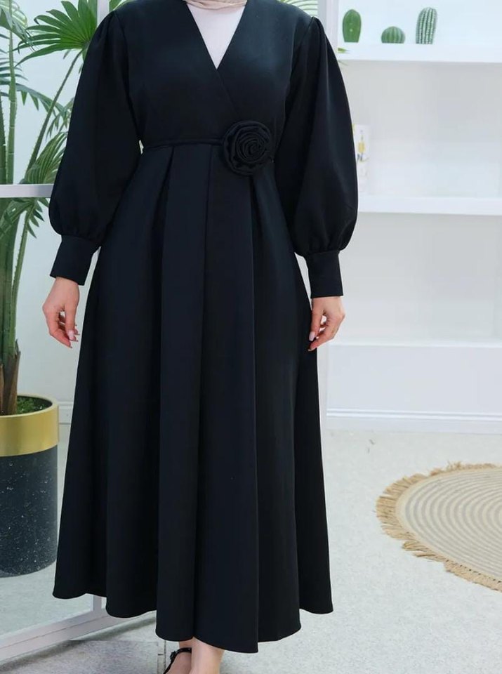Uzun Kollu Siyah Piliseli Uzun Elbise