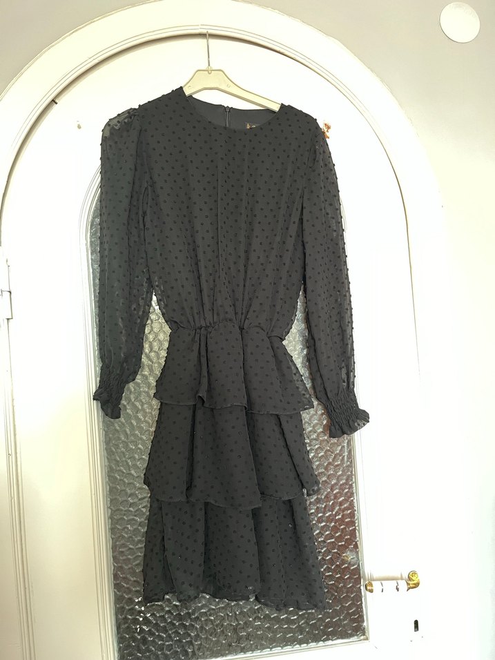 Siyah uzun kollu, puantiyeli ve kat kat fırfırlı bu elbise, gotik tarzı klasik zarafetle buluşturuyor.