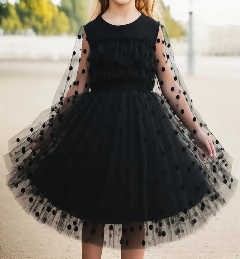 Uzun Kollu Siyah Puantiyeli Kız Çocuk Elbise