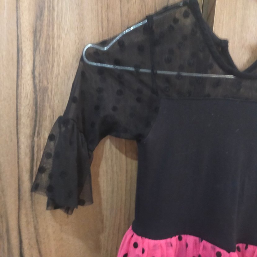 Uzun kollu, fırfırlı ve tekne yakalı siyah puantiyeli kız elbisesi, gotik tarzda tasarlanmıştır.