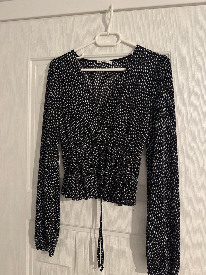 Uzun kollu, V yakalı, düğmeli ve büzgülü bel detaylı siyah puantiyeli mini bluz. Paris tarzı sokak modasına uygun, günlük kullanıma uygundur.