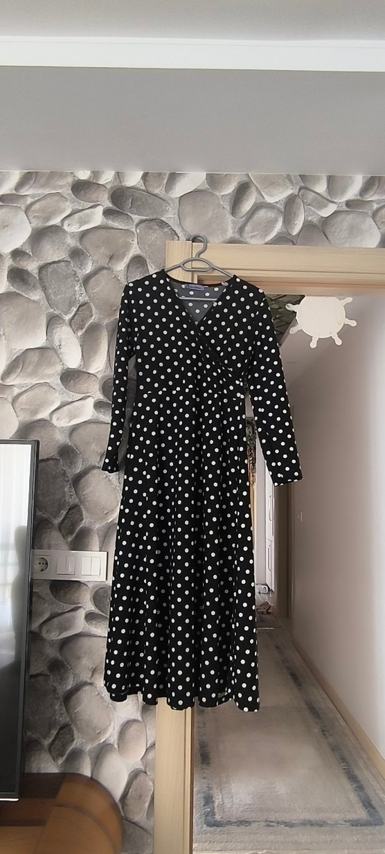 Siyah pamuklu elbise, uzun kollu ve V yakalıdır. Beyaz puantiyeli ve pileli tasarıma sahip, rahat kesimlidir.