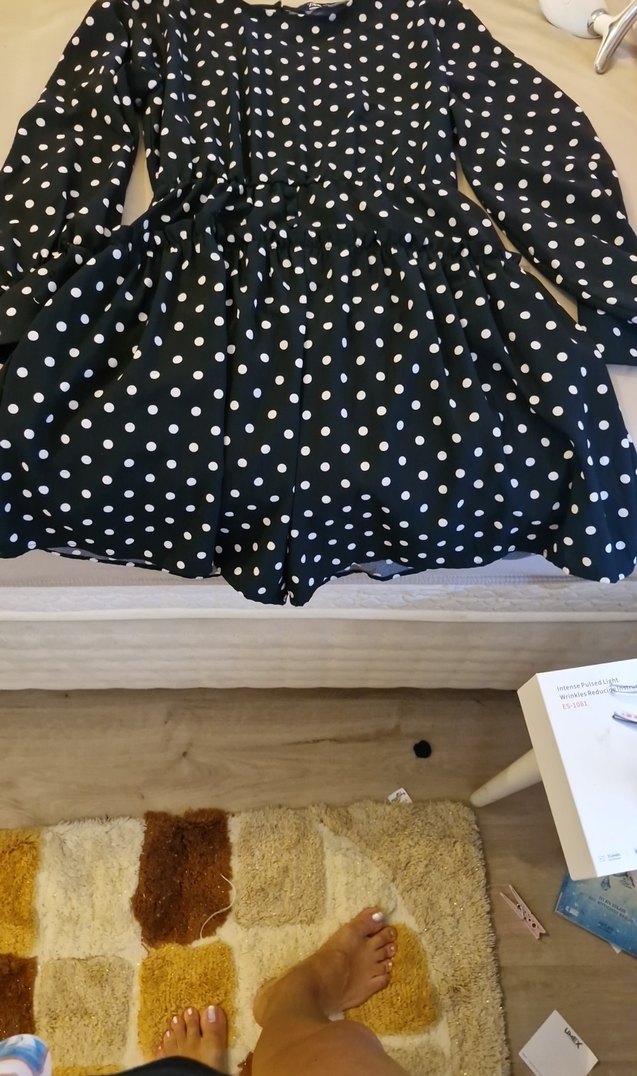 Beyaz puantiyeli siyah sortlu elbise uzun kollu, fırfırlı ve bol kesimdir. Midi boyu günlük kullanım için uygundur.