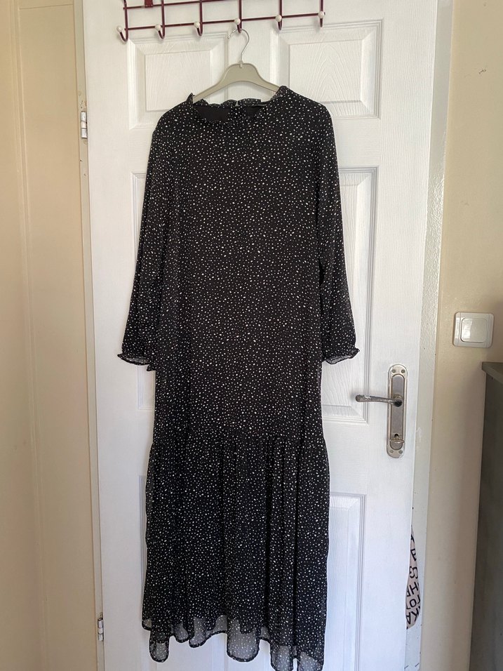 Yüksek yakalı, uzun kollu ve fırfırlı detaylı siyah puantiyeli uzun elbise. Rahat kesimli ve yumuşak sentetik kumaştan, günlük kullanıma uygun. normal şartlarda soramayacağınız soruları sormayın lütfen, ekstrem ölçü talebleriniz olmasın.