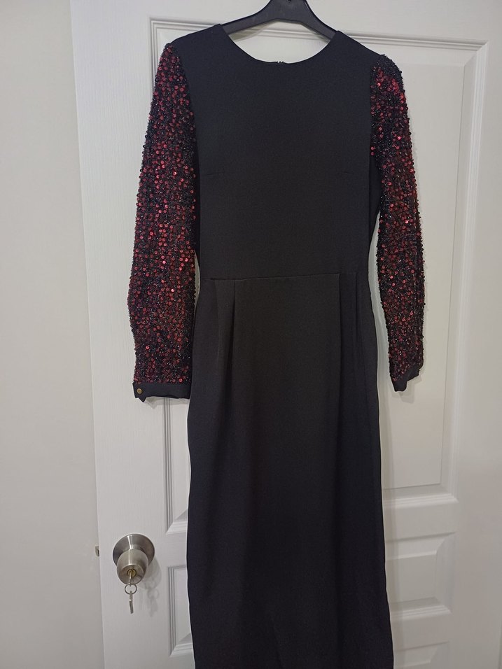 Uzun kollu, pul işlemeli siyah elbise, düz kesim ve yuvarlak yaka ile romantik akşamlar için ideal, göz alıcı gotik tarzda. Elbisemiz kiralıktır. Hiçbir defosu bulunmamaktadır.
