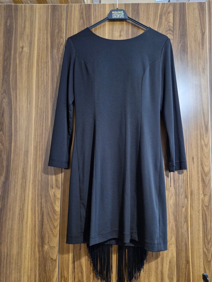 Uzun Kollu Siyah püsküllü sırt dekolteli gece elbise