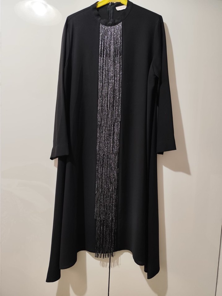 Uzun Kollu Siyah Püsküllü Uzun Elbise