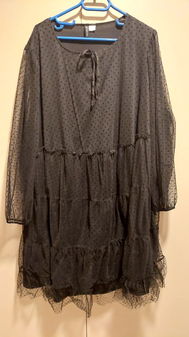 Uzun kollu, bol kesim siyah elbise. Yumuşak sentetik kumaştan, fırfır detaylı ve bağlama yakalı, günlük ve gece kullanım için uygun. Beden 4xl yazıyor ama 5xl gibi
