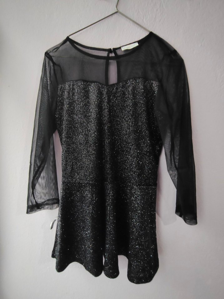 Bu simli siyah midi tunik, uzun şeffaf kollara ve yuvarlak yakaya sahiptir. Sıkı kesimi ve gotik tarzıyla parti için uygundur. ✨