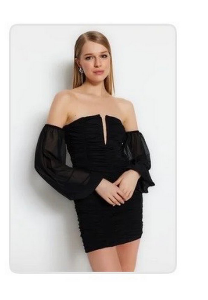 Uzun tül kolları ve straplez yakasıyla, siyah mini elbise cesur ve şık bir görünüm sunar.