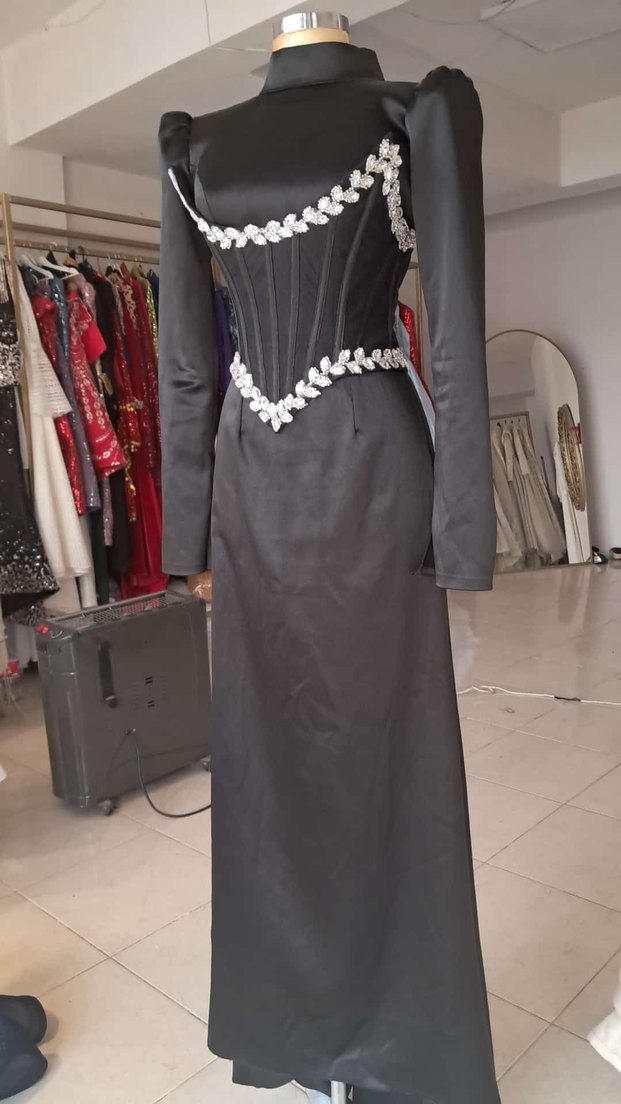 Uzun Kollu Siyah Straplez Nakışlı Abiye Elbise