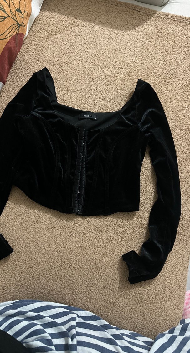 Siyah süet kumaştan, uzun kollu, tek renk, düğmeli ve tekne yaka, günlük kullanıma uygun, vücuda oturan gotik bluz.