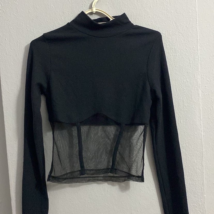 Yüksek yakalı, uzun kollu ve vücuda oturan siyah bluz. Bel kısmı transparan detaylı,temiz,hiç kullanılmamış,L bedene uyumludur