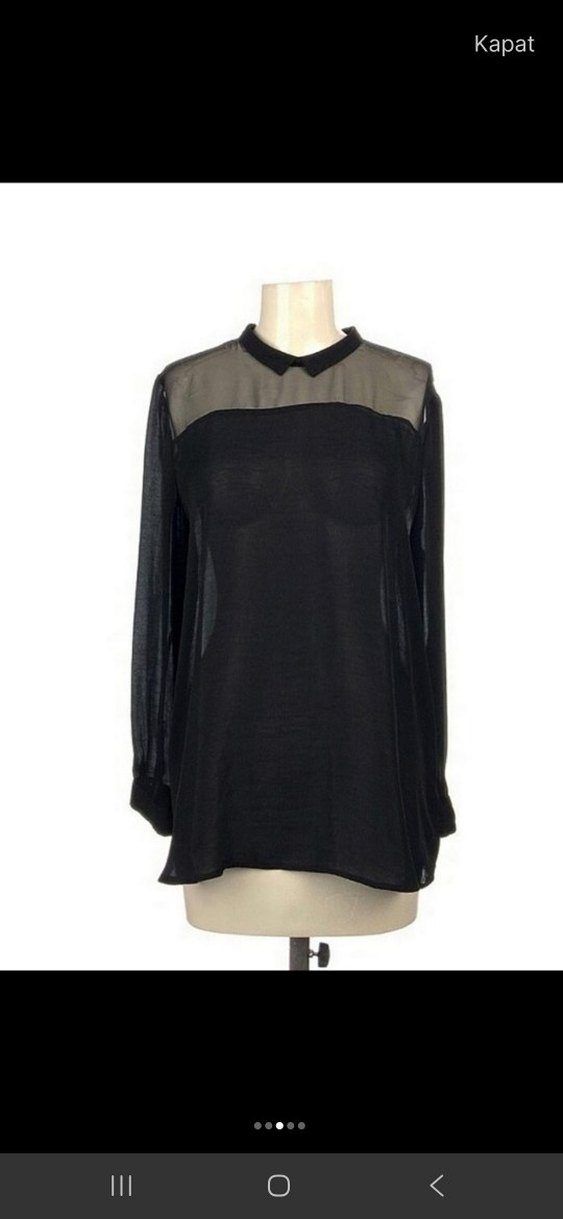 Uzun kollu, yüksek yakalı siyah bluz, transparan üst detaylıdır. Gevşek kesim ve normal boydadır, ofis için uygundur.