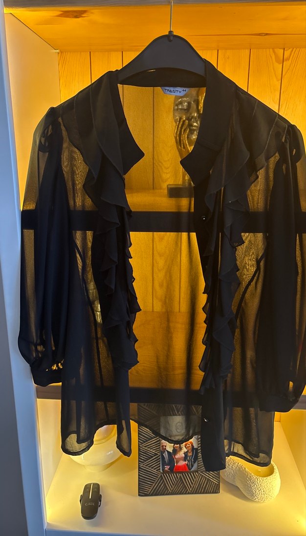 Siyah, uzun kollu, transparan ve ipeksi kumaştan yapılmış gömlek. Dökümlü ve yüksek yakalı, desen içermeyen gotik tarzda, ofis için uygun.