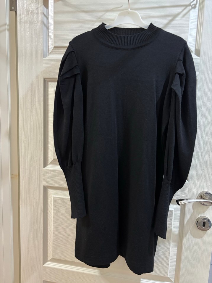 Uzun kollu, fırfırlı detaylı siyah triko elbise. Yüksek yakalı, bol kesim ve uzun boylu, yumuşak ve sıcak kumaştan üretilmiştir. 1 sefer giyildi.