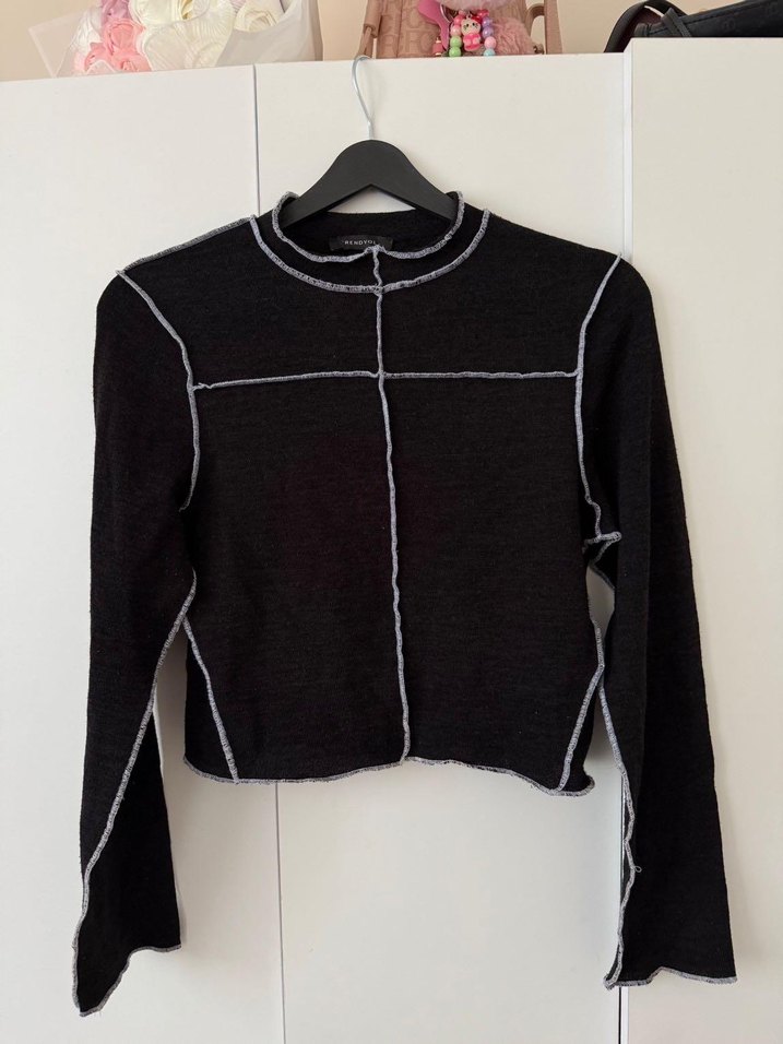 Uzun kollu, bisiklet yaka, siyah triko kadın kazak. Yumuşak ve sıcak dokuma kumaştan, gri kontrast dikiş detaylı, midi boyda, günlük ve sokak stili için uygun.