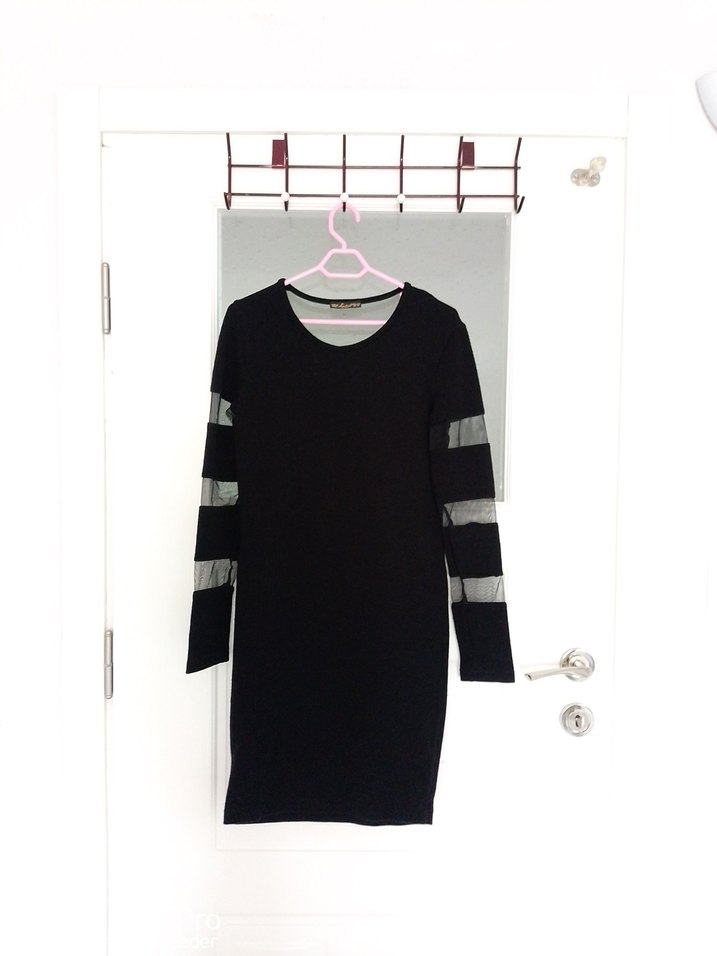 Siyah, uzun kollu, triko kumaştan midi elbise. Dar kesim, yuvarlak yaka ve kollarda şeffaf şerit detaylarıyla minimalist goth tarzı yansıtıyor. Kış için uygun 38 Beden