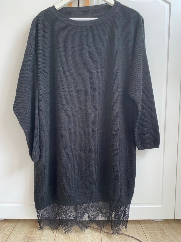 Uzun kollu, bisiklet yaka, bol kesim siyah triko midi elbise. Alt kısmında dantel detay bulunur, rahat ve günlük kullanıma uygundur. Çok esnek dokusu var oversize en esnetmeden 70 cm boy 90 cm