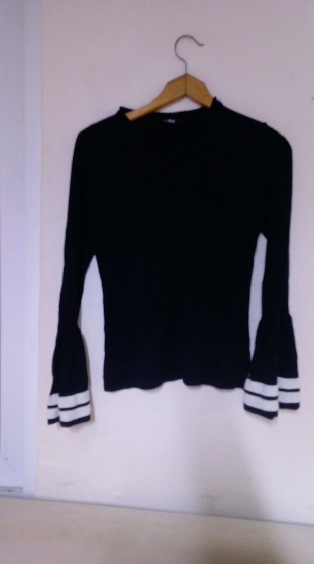 Siyah, uzun kollu, yüksek yakalı ve beyaz çizgili volanlı manşetlere sahip triko, fit kesim kazak.