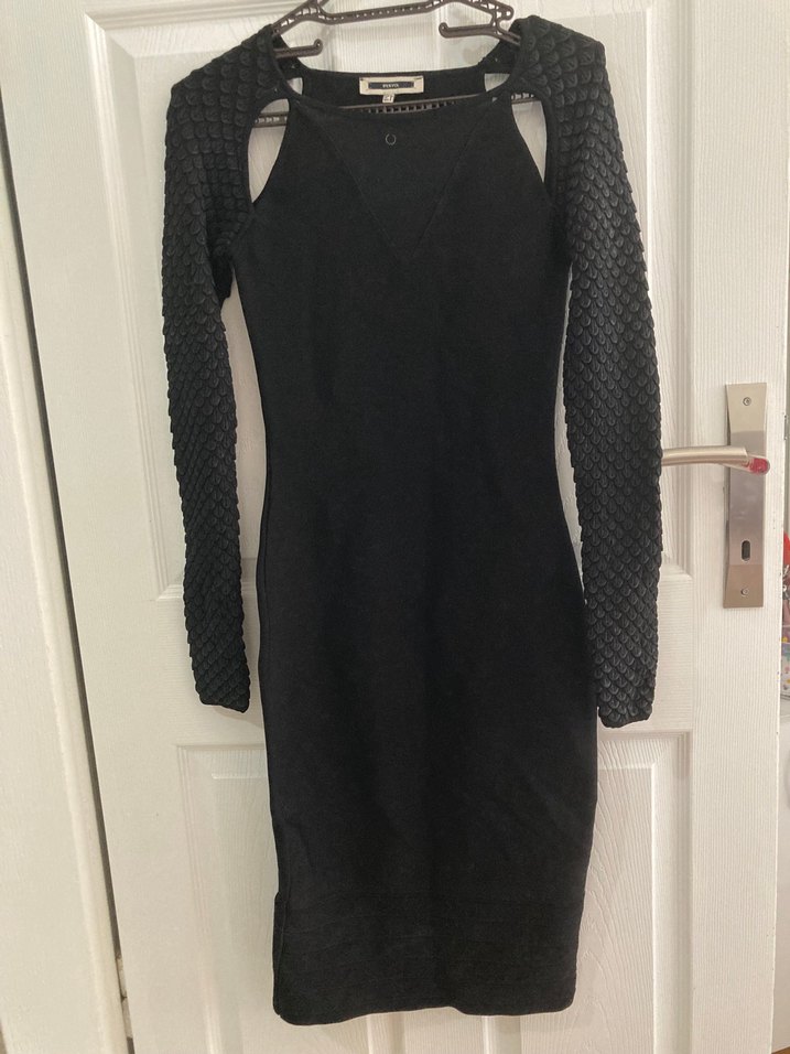 Uzun dokulu triko kollara sahip, siyah ve vücuda oturan kalem uzun elbise.