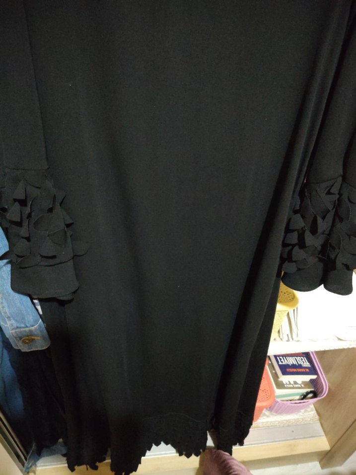 Uzun kollu siyah sentetik kumaştan, bol kesim ve yuvarlak yakalıdır. Kollarında fırfır detayları ve desenli etek ucu bulunur, ofis için uygundur. krep kumaş