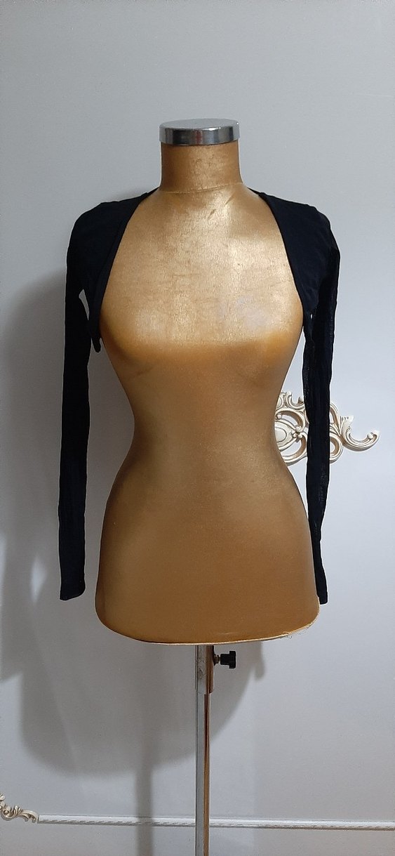 Siyah, straplez yakalı, uzun kollu ve dökümlü tasarıma sahip dar kesim bolero. Pürüzsüz sentetik kumaştan üretilmiştir.