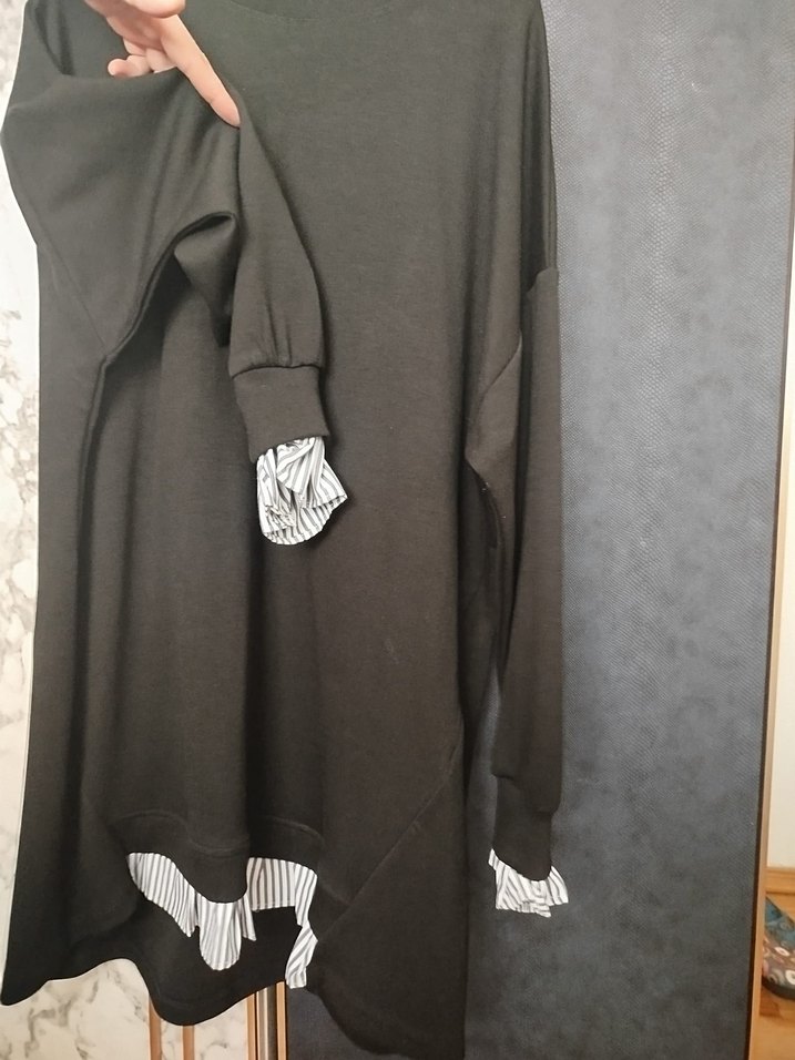 Uzun kollu, bol kesim tunik, kol ve etek uçlarında fırfır detaylı, yumuşak sentetik kumaştan, koyu gri renkte, günlük sokak stiline uygun.