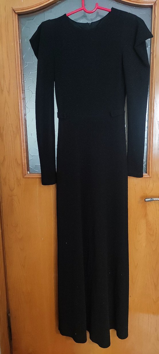 Uzun kollu, siyah renkli, notched lapel yakalı uzun elbisedir. Rahat kesim ve sıcak dokulu kumaştan, düğün için uygundur. 34 beden fakat ben 38 beden olmama rağmen çok rahat ve şık durdu.