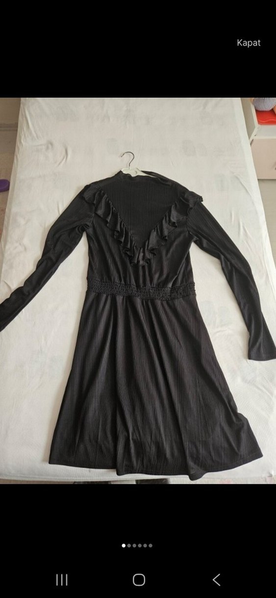 Fitted kesim siyah triko elbise, uzun kollu ve fırfır detaylıdır. Uzun boyu ve yumuşak sentetik kumaşıyla günlük kullanıma uygundur. Gösterdigim gibi biraz transparan, bence siyah oldugu icin ic gostermiyor ama tul oldugunu goz onunde bulundurarak aliniz.