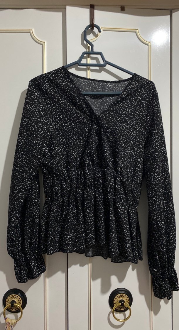 Uzun kollu, V yakalı, siyah bluz. Ruffle detaylı ve midi boyda, rahat kesimli. Yumuşak sentetik kumaştan, günlük sokak stili için uygundur.