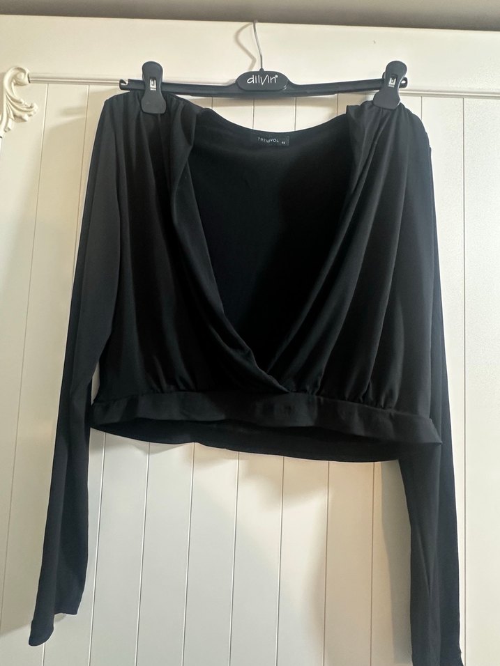 Drapeli V yaka ve uzun kollu, fitted kesim siyah bluz. Vatkalı omuz 42 beden trendyolmilla